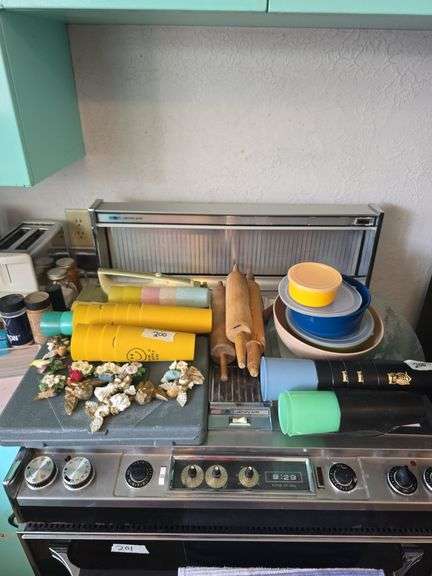 LOT 200 - Antique wood cannisters, Saltine vintage tin, toaster, large glass bowl and misc. kitchen items.