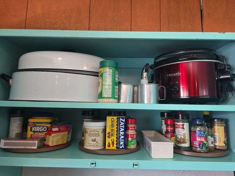LOT 198 - Vintage Enamel roaster oven, crock pot and misc. items in cabinet.