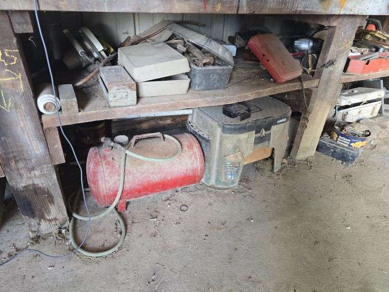 LOT 325 - portable air tank, and tools on 2 shelves.