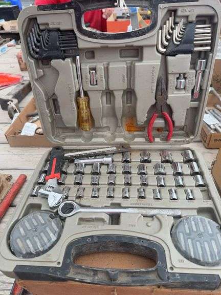 LOT 245 - 46pc garage tool set missing some pieces, sprayer bottles
