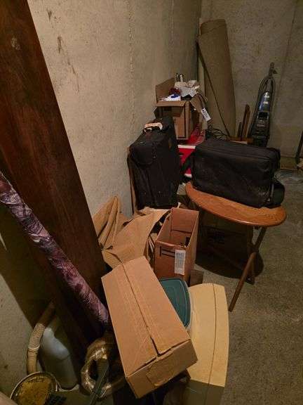 Luggage, carpet, extension cords, baking pans, cooler, and misc.